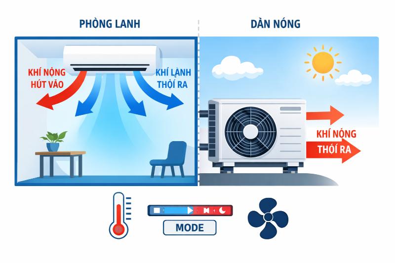 Điều hòa hoạt động theo nguyên lý: hút nhiệt trong phòng → xử lý → thổi khí lạnh ra. Toàn bộ hiệu quả phụ thuộc vào 3 yếu tố cài đặt dưới đây: