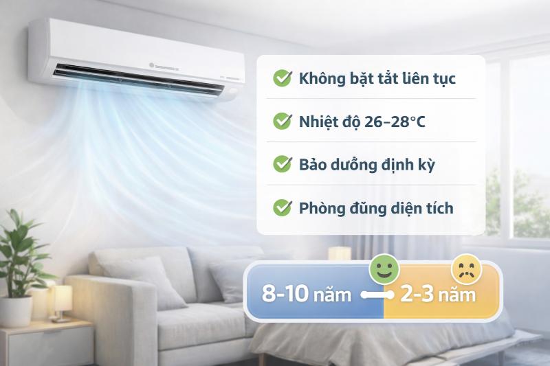 Một chiếc điều hòa sử dụng đúng cách có thể bền từ 8–10 năm. Ngược lại, nếu dùng sai (để nhiệt độ quá thấp, bật tắt liên tục, không bảo dưỡng), chỉ sau 2–3 năm máy đã xuống cấp rõ rệt. Dùng điều hòa bền không khó. Chỉ cần tránh các thói quen sai và duy trì bảo dưỡng định kỳ, bạn sẽ tiết kiệm được rất nhiều chi phí sửa chữa điều hòa trần về lâu dài.