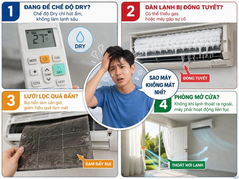 - Sai chế độ (Mode): Điều hòa đang để Dry hoặc Fan thay vì Cool. Hai chế độ này không làm lạnh sâu, nên dù máy hoạt động nhưng nhiệt độ phòng không giảm đáng kể.