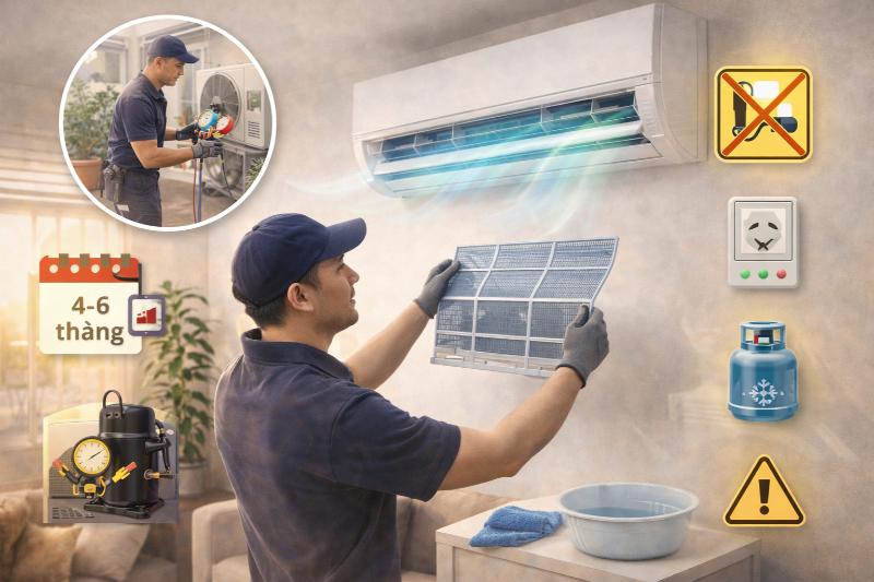 + Vệ sinh và bảo dưỡng định kỳ cho máy điều hòa tránh tình trạng máy điều hòa mở không lên. Thực hiện vệ sinh và bảo dưỡng định kỳ máy điều hòa nhiệt độ là cách tốt nhất để tăng tuổi thọ cho máy. Người sử dụng nên vệ sinh bộ lọc, quạt, ống đồng, cục nóng, cục lạnh và các bộ phận khác của máy định kỳ để giữ cho máy luôn hoạt động tốt nhất. Thời gian vệ sinh định kỳ tối thiểu cho máy lạnh sử dụng tại nhà sẽ là từ 5 – 6 tháng 1 lần.
