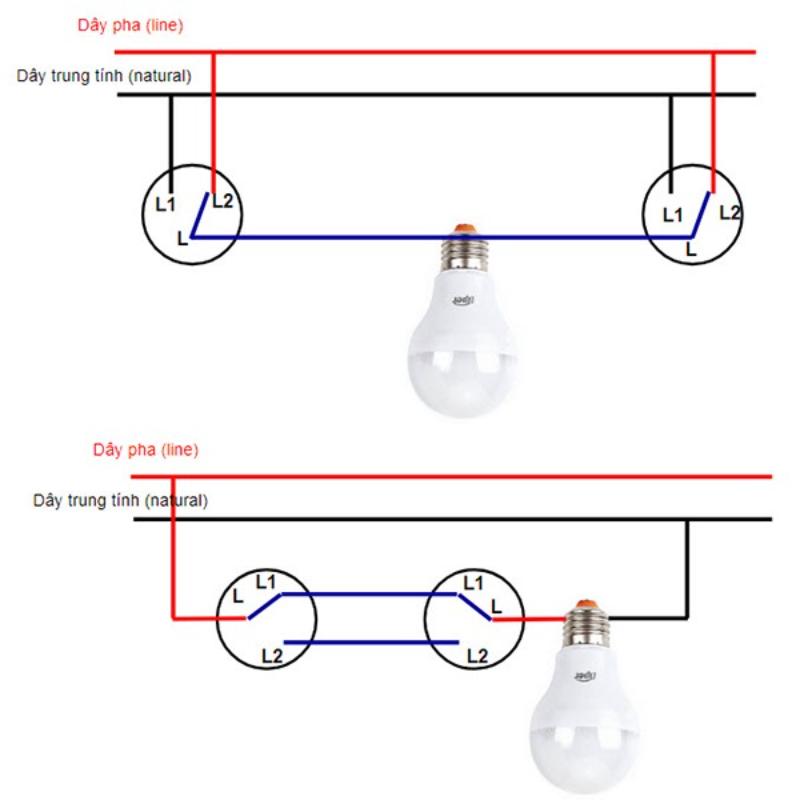 Khi bất kỳ công tắc nào được bật, mạch điện sẽ hoàn thành và đèn sáng. Khi một công tắc bị tắt, mạch bị ngắt và đèn tắt. Nguyên lý này phù hợp cho nhà nhiều tầng hoặc cầu thang dài, nơi cần điều khiển đèn từ nhiều điểm khác nhau.