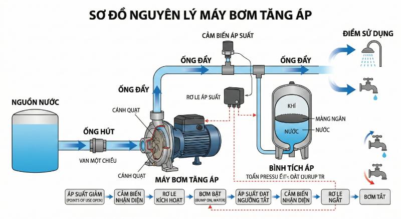 Chỉ tìm “cách lắp” theo vài bước đơn giản là chưa đủ. Bạn cần hiểu nguyên lý vận hành để lắp theo sơ đồ lắp máy bơm nước tăng áp đúng chuẩn.
