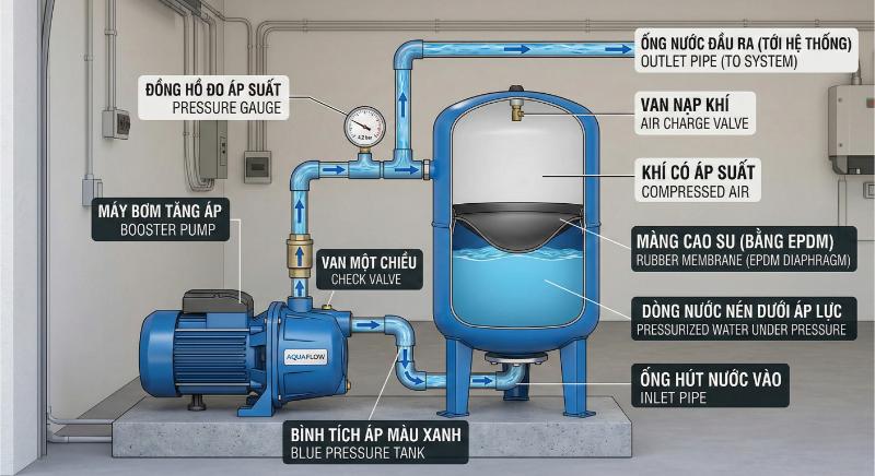 Trong hệ thống máy bơm tăng áp, bình tích áp đóng vai trò như một “bộ đệm áp lực” giúp toàn bộ hệ thống vận hành ổn định hơn. Thay vì để máy bơm phải khởi động mỗi khi áp suất giảm nhẹ, bình sẽ tích trữ một lượng nước dưới áp lực ổn định và sử dụng lượng nước này trước.