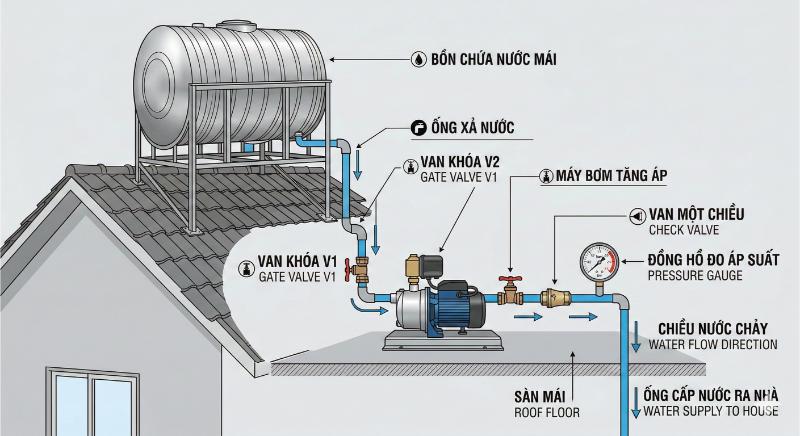 Sơ đồ lắp sau bồn nước (Phổ biến nhất cho nhà 2–4 tầng)