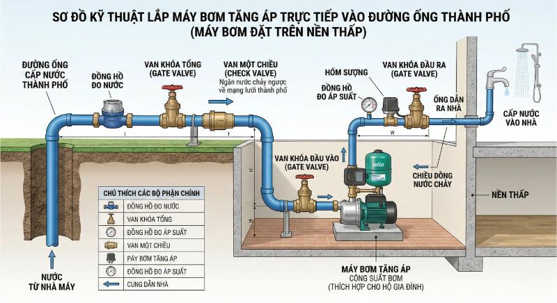 Ngoài ra, một số khu vực không cho phép lắp bơm trực tiếp vào đường ống chung vì có thể ảnh hưởng hệ thống cấp nước toàn khu và gây sụt áp cho các hộ khác. Bạn nên kiểm tra quy định địa phương trước khi thực hiện.