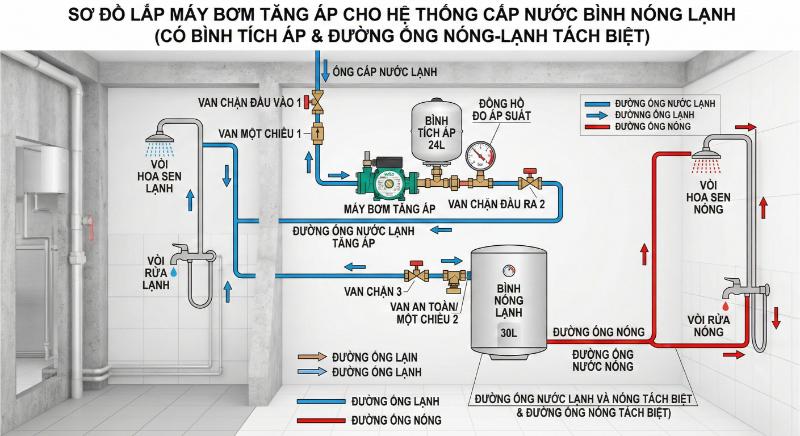 Phương án này thường áp dụng cho nhà không có bồn chứa, chung cư hoặc nhà phố sử dụng trực tiếp nước máy. Tuy nhiên, đây là cách lắp cần tính toán kỹ vì áp suất đầu vào thay đổi liên tục.